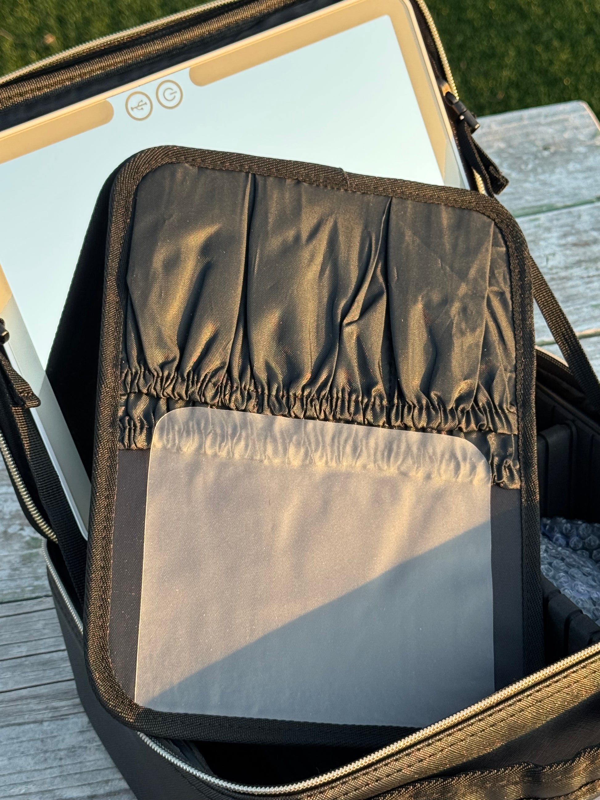 Upgrade your beauty routine with this light-up vanity makeup box, featuring a custom tooled leather patch, hand-drawn, tooled, dyed, and painted for a unique touch.