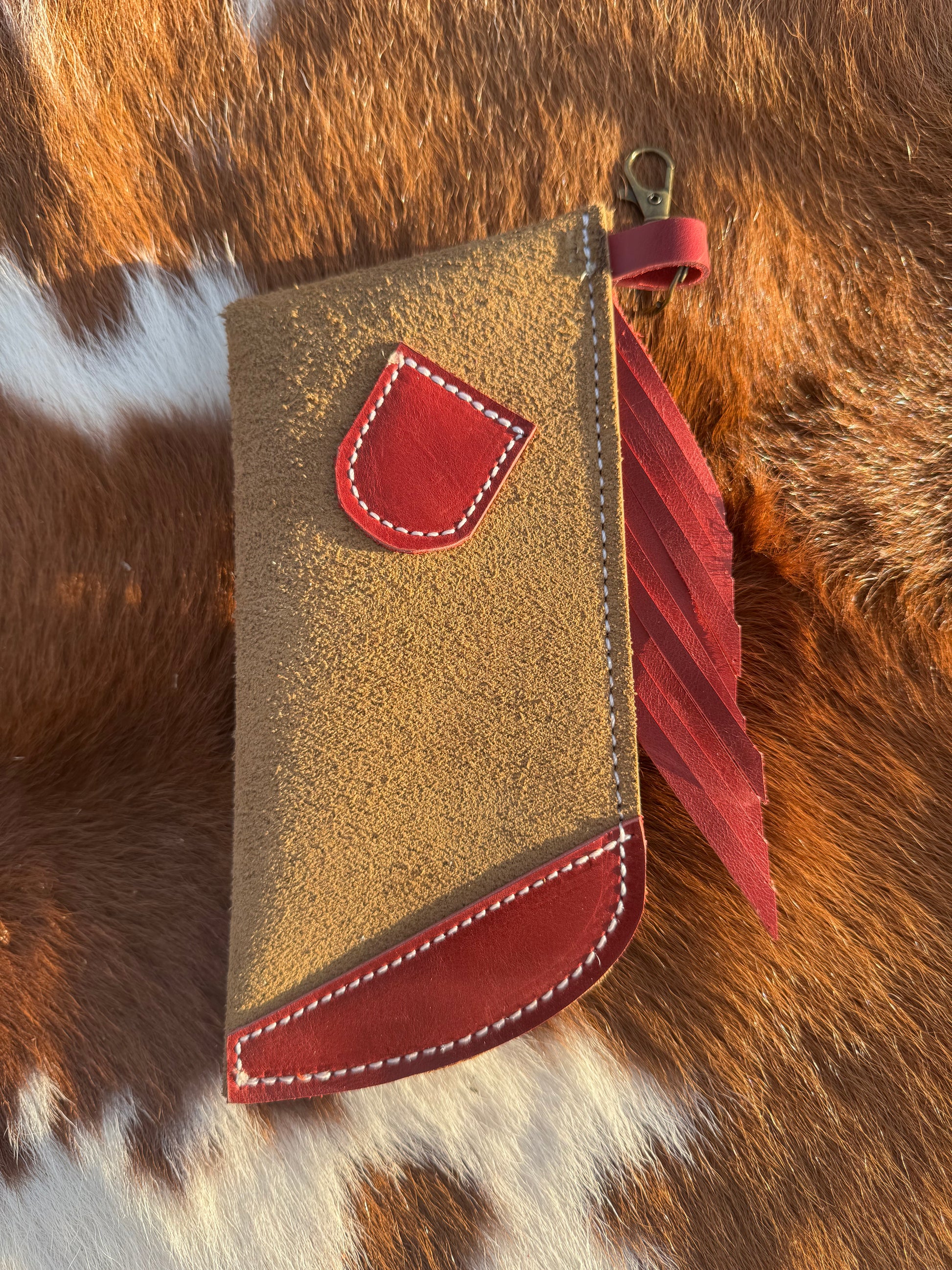 These “chap” stick sunglass holders are going to keep your chapstick and sunglasses together while you’re on the go, working, or at a stockshow/rodeo! They measure approximately 7 inches by 3.5 inches. Made to fit larger aviator glasses and below. Each chapstick holder is handmade by yours truly in the panhandle of Texas with various colors of leather. Leather is a natural product, and each hide has imperfections and markings that make them beautiful and unique. So no two are alike. Slick on roughout leather texture.