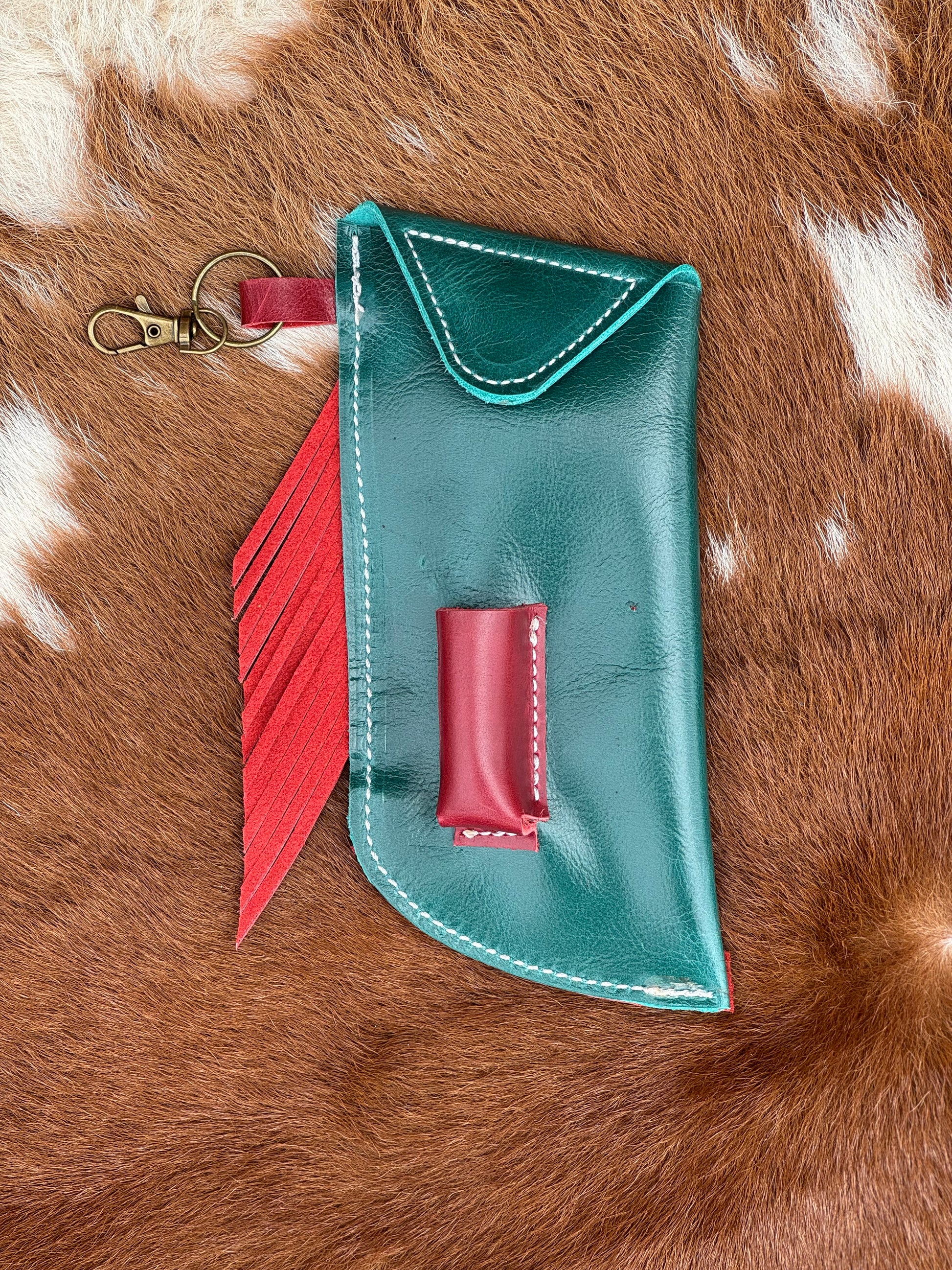 These “chap” stick sunglass holders are going to keep your chapstick and sunglasses together while you’re on the go, working, or at a stockshow/rodeo! They measure approximately 7 inches by 3.5 inches. Made to fit larger aviator glasses and below. Each chapstick holder is handmade by yours truly in the panhandle of Texas with various colors of leather. Leather is a natural product, and each hide has imperfections and markings that make them beautiful and unique. So no two are alike. Slick on slick leather texture.