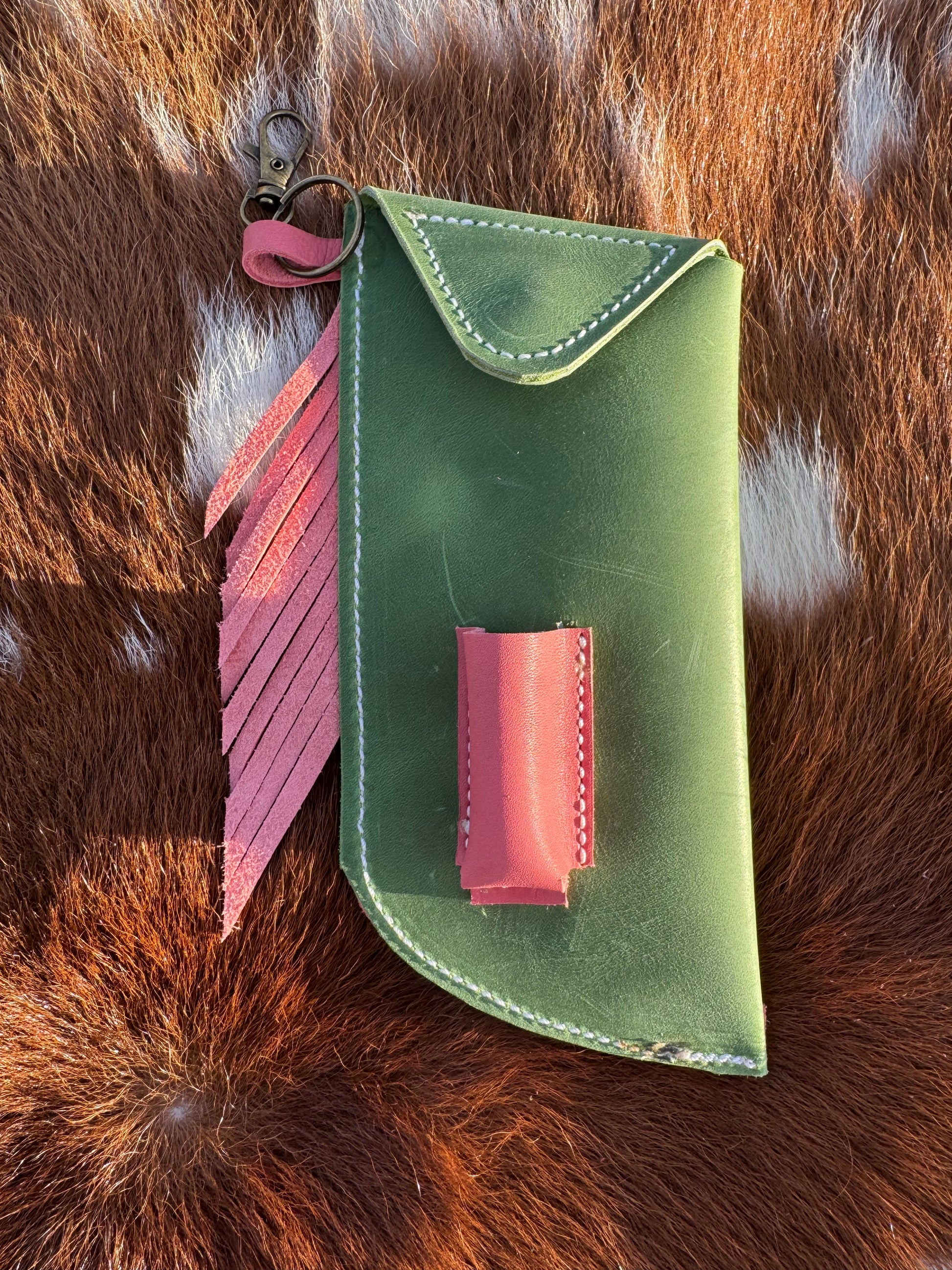 These “chap” stick sunglass holders are going to keep your chapstick and sunglasses together while you’re on the go, working, or at a stockshow/rodeo! They measure approximately 7 inches by 3.5 inches. Made to fit larger aviator glasses and below. Each chapstick holder is handmade by yours truly in the panhandle of Texas with various colors of leather. Leather is a natural product, and each hide has imperfections and markings that make them beautiful and unique. So no two are alike. Slick on slick leather texture.