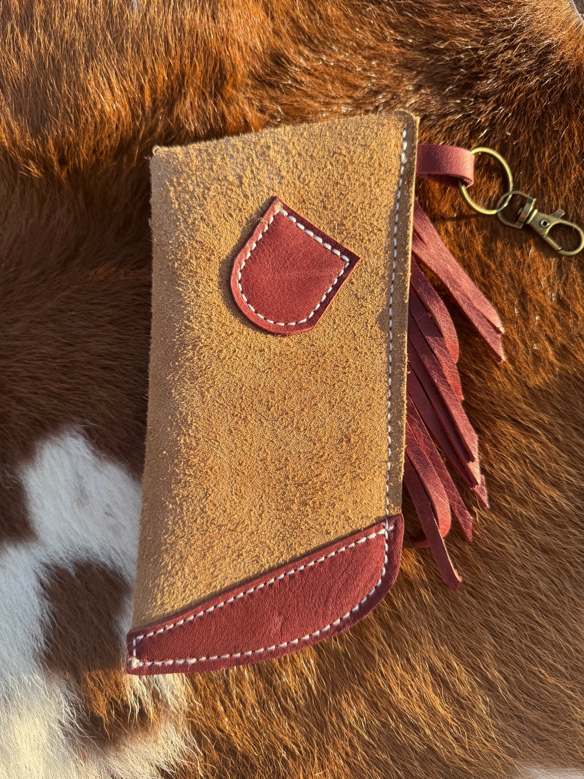 These “chap” stick sunglass holders are going to keep your chapstick and sunglasses together while you’re on the go, working, or at a stockshow/rodeo! They measure approximately 7 inches by 3.5 inches. Made to fit larger aviator glasses and below. Each chapstick holder is handmade by yours truly in the panhandle of Texas with various colors of leather. Leather is a natural product, and each hide has imperfections and markings that make them beautiful and unique. So no two are alike. Slick on roughout leather texture.