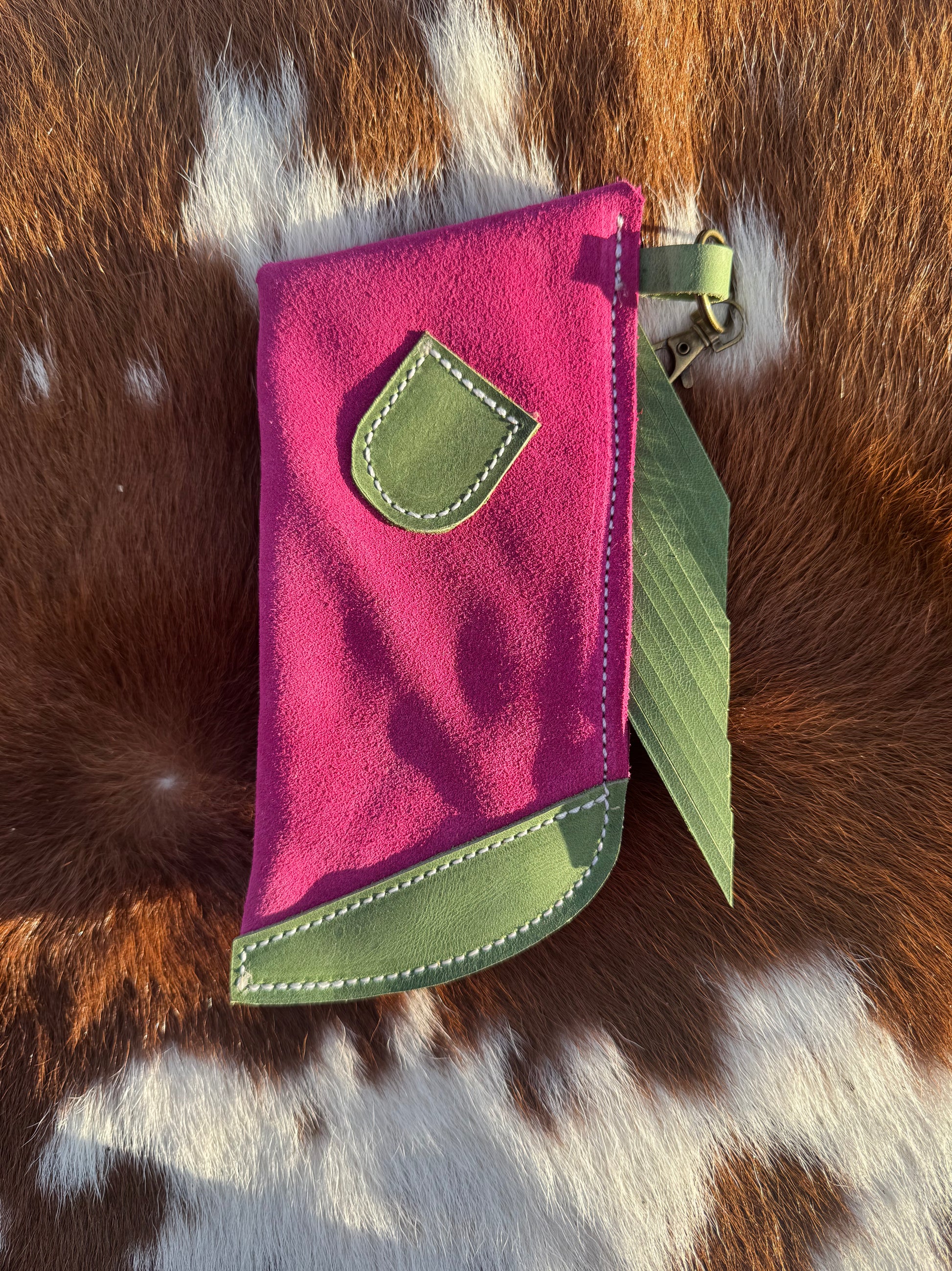 These “chap” stick sunglass holders are going to keep your chapstick and sunglasses together while you’re on the go, working, or at a stockshow/rodeo! They measure approximately 7 inches by 3.5 inches. Made to fit larger aviator glasses and below. Each chapstick holder is handmade by yours truly in the panhandle of Texas with various colors of leather. Leather is a natural product, and each hide has imperfections and markings that make them beautiful and unique. So no two are alike. slick on rough out leather texture.