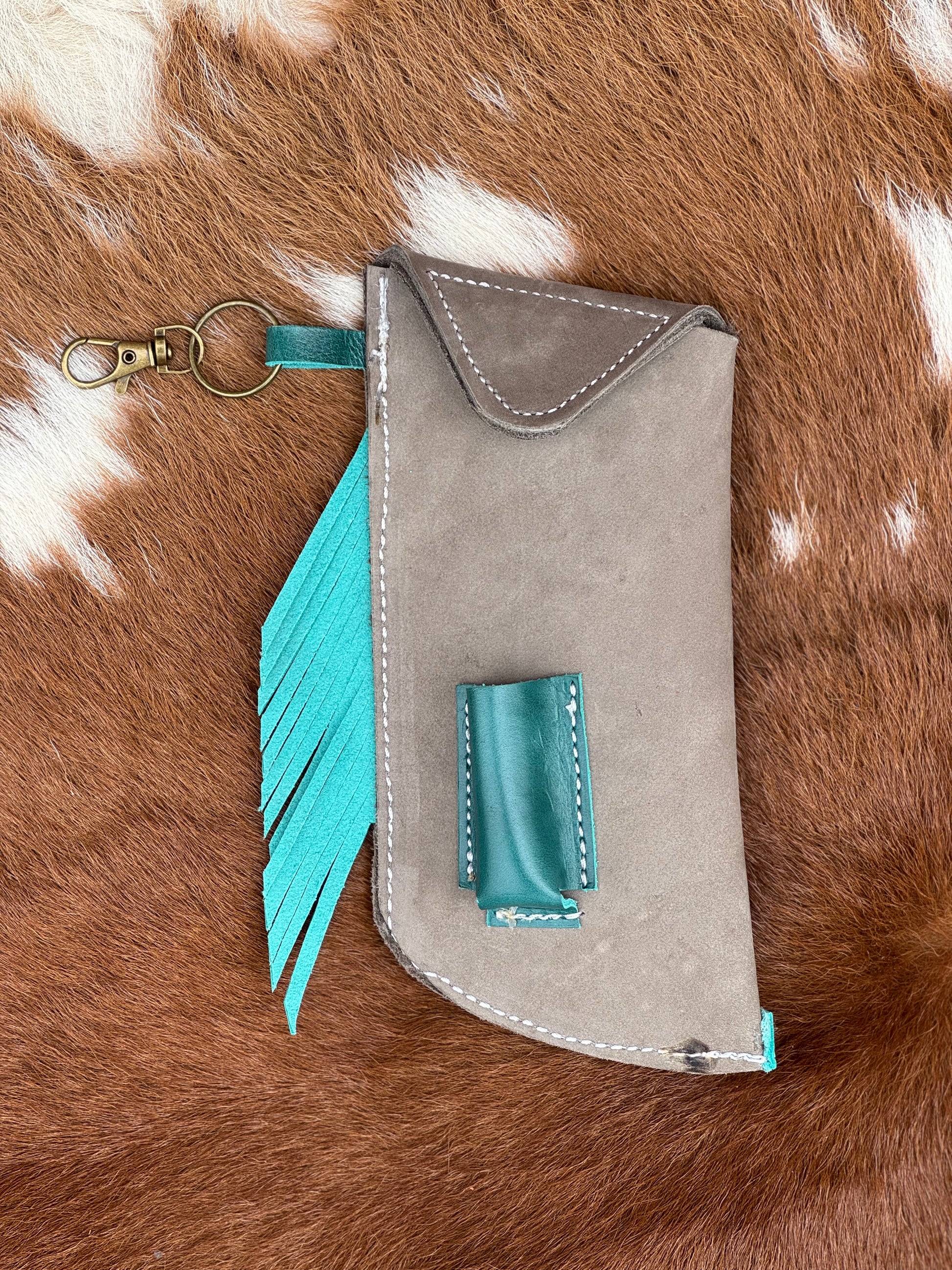 These “chap” stick sunglass holders are going to keep your chapstick and sunglasses together while you’re on the go, working, or at a stockshow/rodeo! They measure approximately 7 inches by 3.5 inches. Made to fit larger aviator glasses and below. Each chapstick holder is handmade by yours truly in the panhandle of Texas with various colors of leather. Leather is a natural product, and each hide has imperfections and markings that make them beautiful and unique. So no two are alike. Slick on slick leather texture.