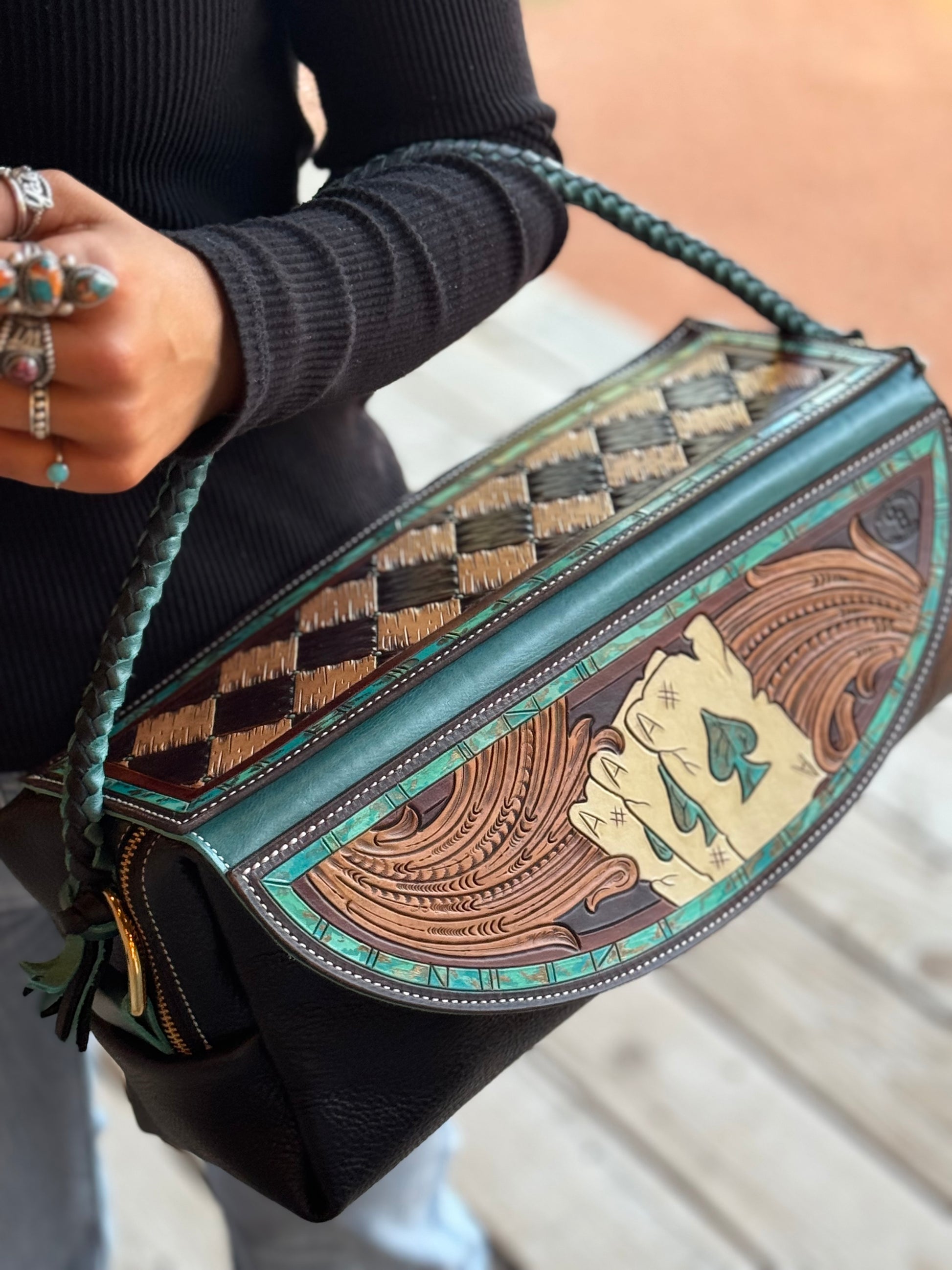 This bag is perfect for all your makeup essentials and more. The dimensions are approximately 16X5X6. Long enough to fit a flat iron and or curling iron for a gal on the go! A hand beaded strap to match the bag and flap color scheme!