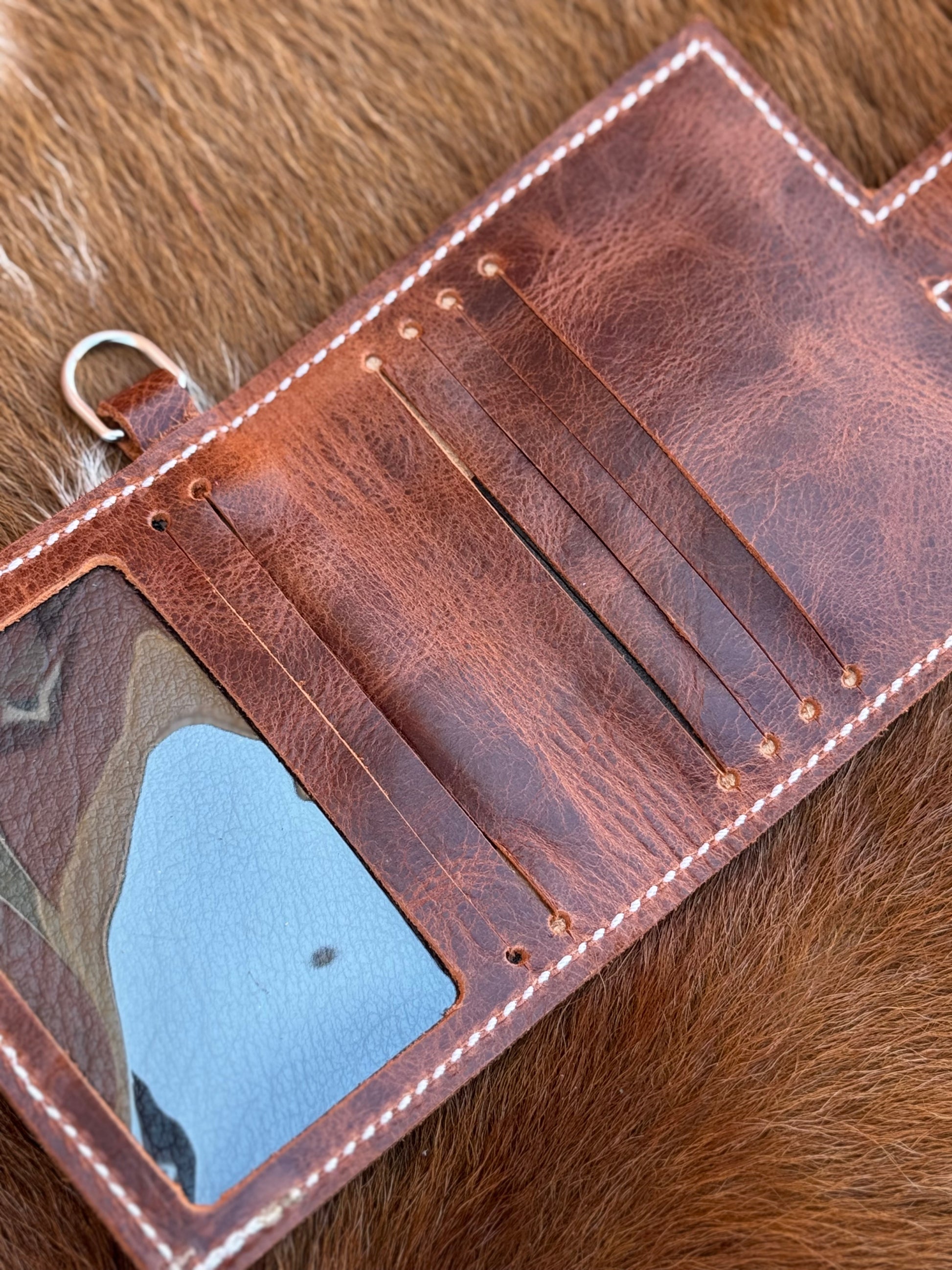 This mini wallet is perfect for the gal on the go. This sweet little piece is approximately 4 X 3.5 inches with a snap to keep all your cards secure. With a 5 card slot plus a clear driver’s license slot. Each mini wallet has a ring to hang keys or other trinkets on!