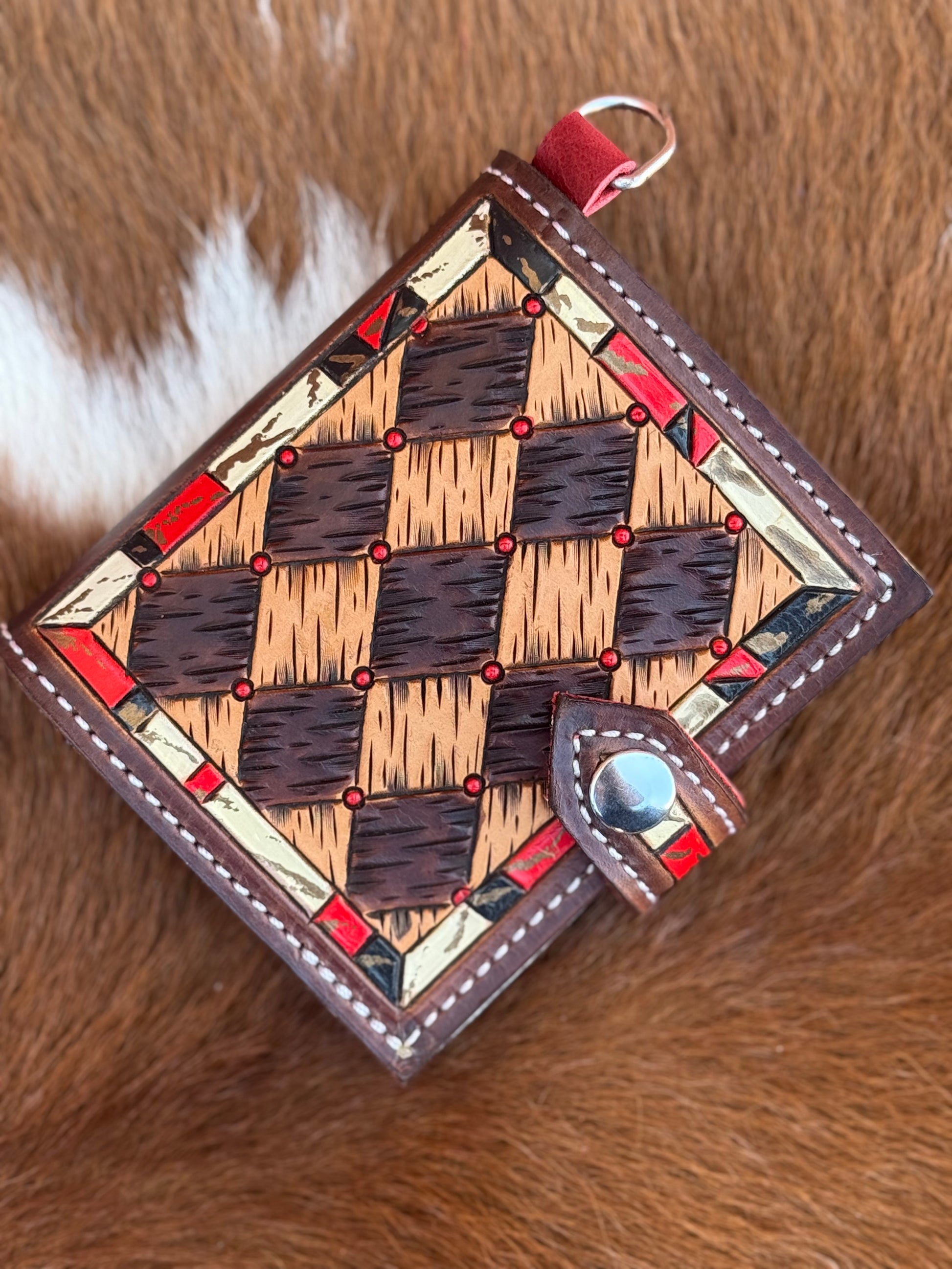This mini wallet is perfect for the gal on the go. This sweet little piece is approximately 4 X 3.5 inches with a snap to keep all your cards secure. With a 5 card slot plus a clear driver’s license slot. Each mini wallet has a ring to hang keys or other trinkets on!